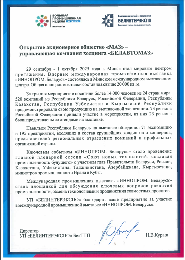 Благодарность за участие в Международной промышленной выставке "ИННОПРОМ. БЕЛАРУСЬ"