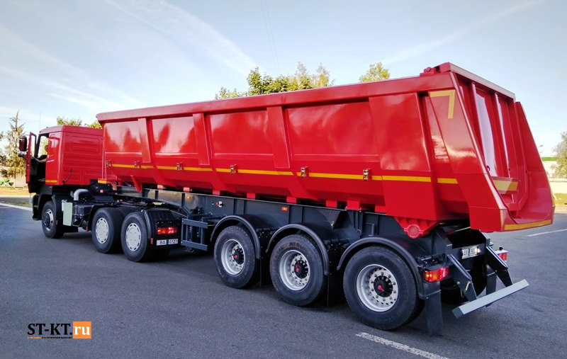Осевые агрегаты названных марок по выбору заказчика применяются и в конструкции трехосного самосвального полуприцепа МАЗ-953003-030-010, рассчитанного на перевозку в своем 30-кубовом кузове 31 тонны сыпучих грузов. Снаряженная масса данной модели, при изготовлении которой используются высокопрочные стали HARDOX и S700, составляет 8 тонн. Механизм укрытия тентом и площадка включены в число дополнительного оборудования.