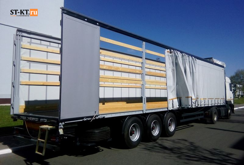 У второго «шторника» с классической конструкцией платформы (пять пар алюминиевых бортов) объем пространства под тентом увеличен примерно на 18 м3. По сравнению с первым из названных полуприцепов он вышел на полторы тонны тяжелее и рассчитан на перевозку грузов массой до 29,5 тонны. Разработчики отмечают, что за счет применения импортных комплектующих, включая осевые агрегаты с пневматической подвеской SAF или BPW, удалось повысить гарантийные обязательства на новые шторные полуприцепы, которые теперь составляют два года или 200 000 км пробега.