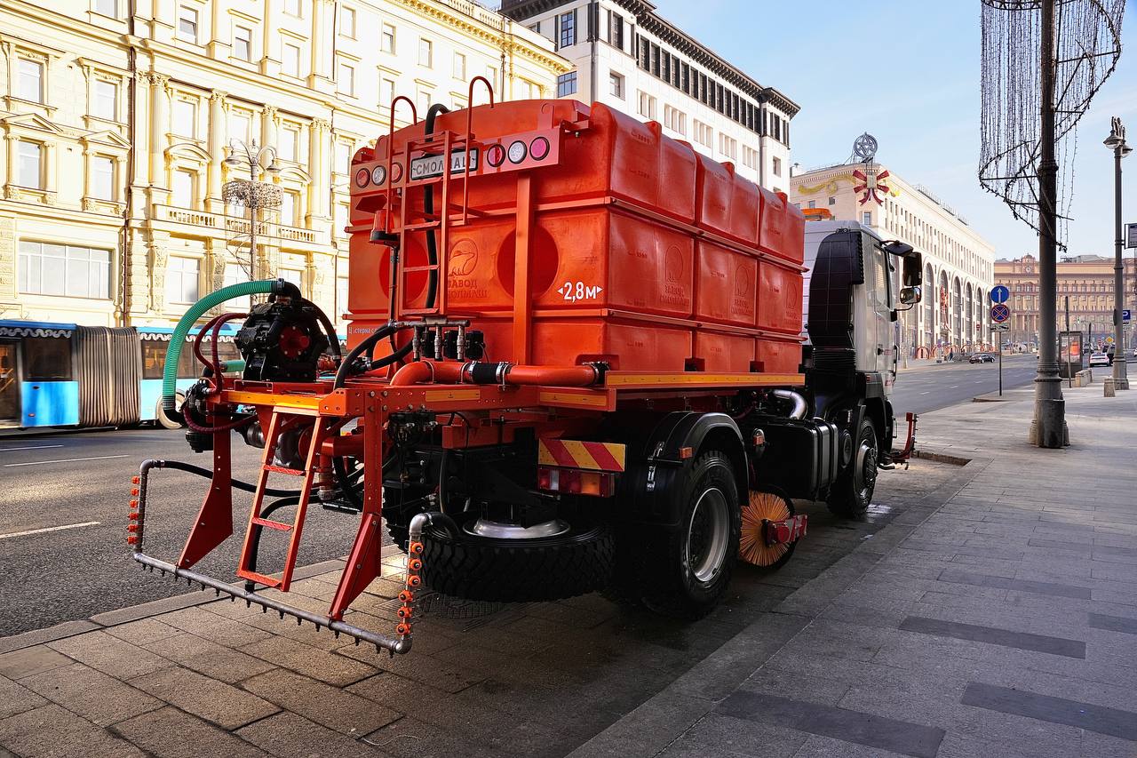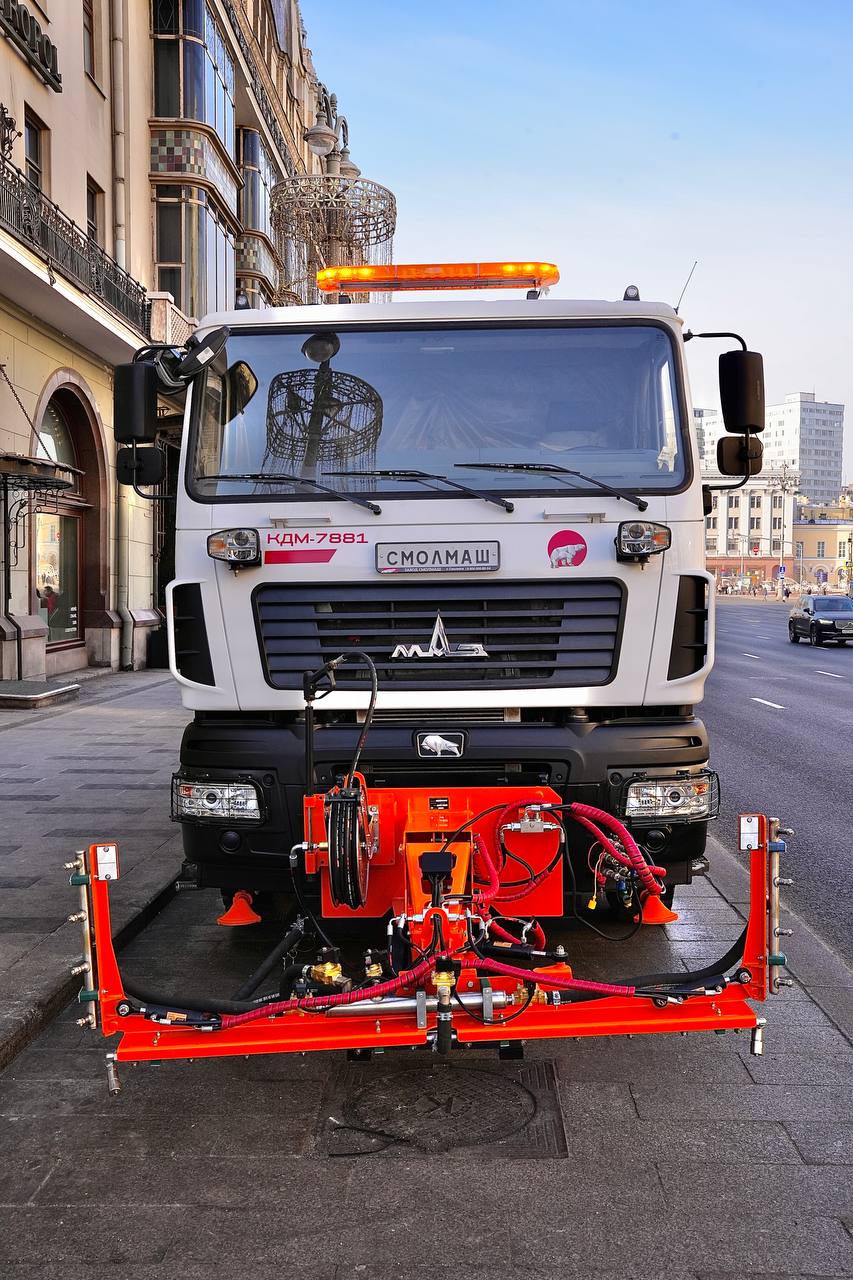 Здесь представлена комбинированная дорожная машина КДМ 7881250 на базе шасси МАЗ-534025 с отбором мощности от двигателя для летнего содержания дорог.