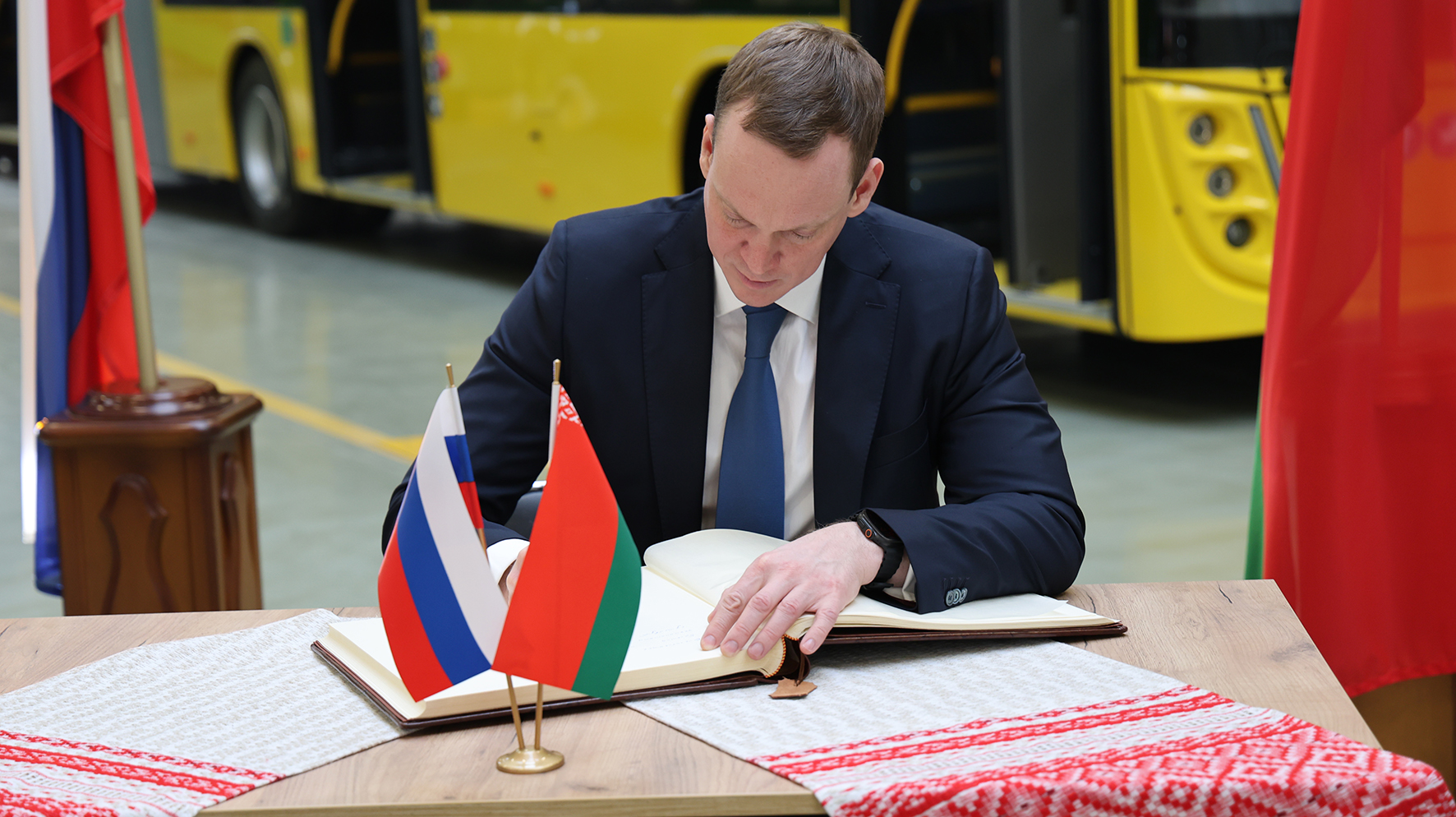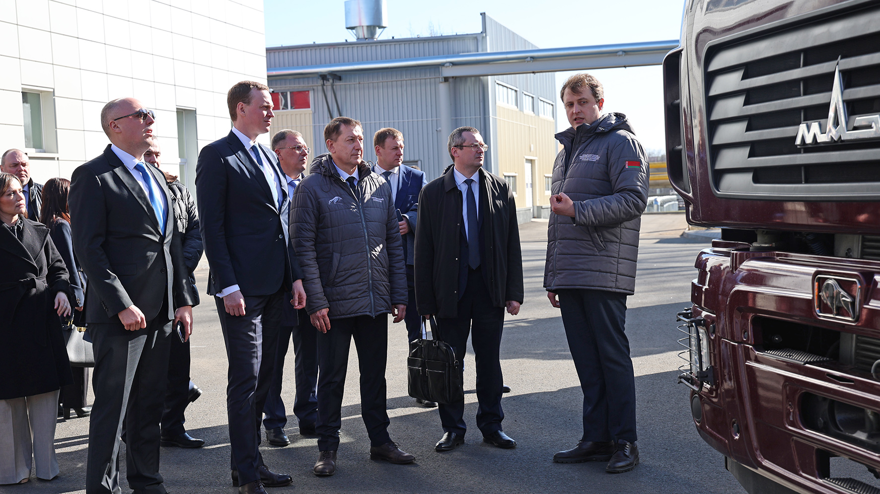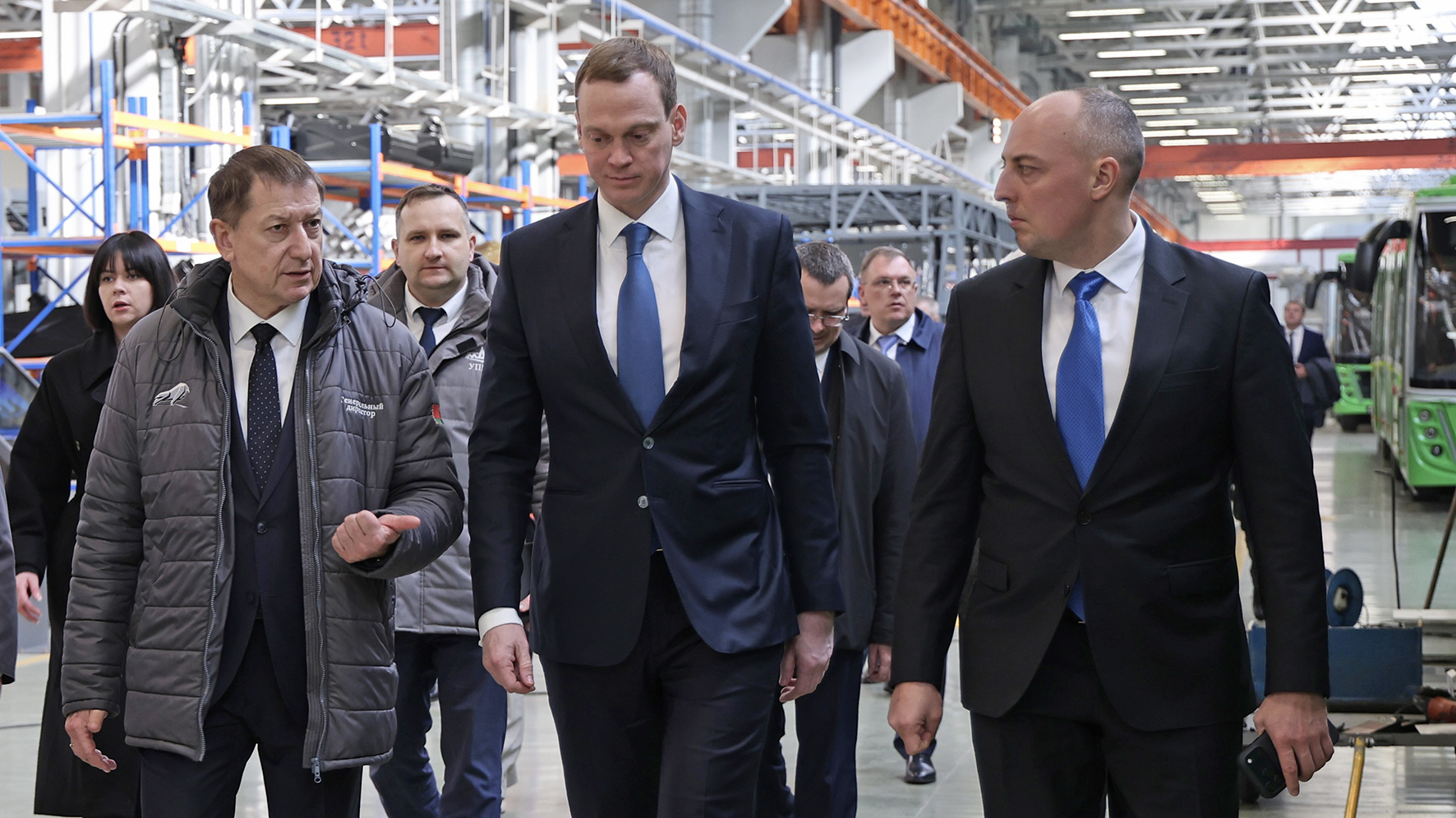 В сопровождении генерального директора ОАО «МАЗ» - управляющая компания холдинга «БЕЛАВТОМАЗ» Валерия Иванковича губернатор российского региона Павел Малков ознакомился с новым цехом автобусного завода, а также изучил последние образцы техники МАЗ.