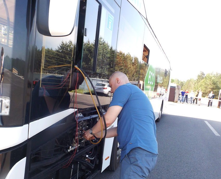 Полдесятого. Мы уже на месте и перед нами — асфальтированная ровная дорожная полоса, несколько спусков с разным углом наклона и площадки для маневров. Начинаем подготовку к испытаниям: подключается немецкая аппаратура «Peiseler». Как объяснил Александр Иванович, с помощью этого устройства у электробуса будут измеряться путь, время и скорость. Также устанавливаются два манометра для определения давления на заднем и переднем контурах. Сзади автобуса крепят колесо — то самое, так похожее на колесо велосипеда — именно оно будет фиксировать и передавать информацию об эффективности замедления электробуса во время торможения. Водитель нажимает на педаль тормоза, чтобы проверить работу приборов, и стрелки манометров тут же идут в ход. Готово, можно приступать!