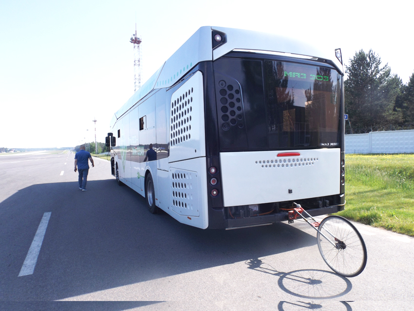 Почти полдень. На обратном пути к автозаводу Александр Иванович резюмирует: «Аварийная тормозная система, по данным прибора, немного до норматива не дотягивает. Недостаточное замедление. Возможно, что-то в тормозных камерах или надо колодкам дать больше времени на приработку для лучшей работы — будем совместно с конструкторами выяснять. Интересно, что в автобусе МАЗ 303266 и электробусе МАЗ 303Е10 фактически одна тормозная система, однако вторая не прошла все эти испытания также успешно. Но ведь для того это и нужно, чтобы доводить дело до совершенства».