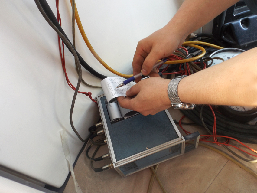 — Вот смотри, — показывает А. Гурский на ленту с написанными данными, которую «выдал» немецкий прибор. — В последней графе показывается замедление, которое фиксируется колесом. По нормативам, в данном виде испытаний должно быть среднее значение не менее -5 м/с2, у нас показатели варьируются между -6,4 – -6,9 м/с2 — это очень хороший результат. Конечно, для протокола более точные данные мы высчитаем с помощью специальной формулы, но уже сейчас можно сделать вывод, что это испытание электробус прошел успешно.