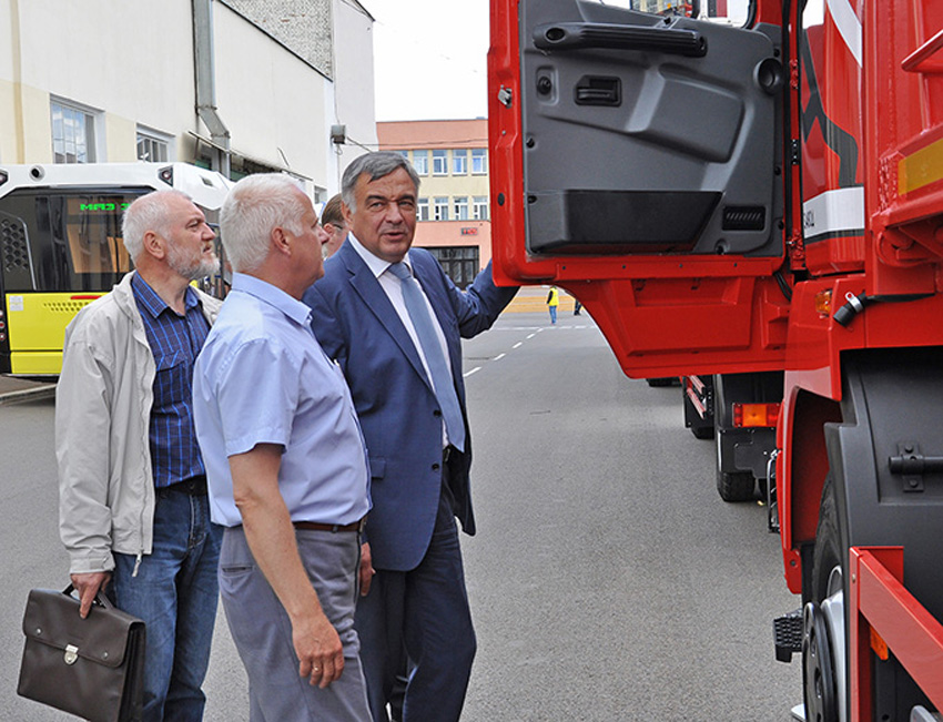 Прежде чем сесть за стол переговоров, главный конструктор ОАО «МАЗ» - управляющая компания холдинга «БЕЛАВТОМАЗ» Александр Мышко провел экскурсию по выставке новейших образцов продукции, производимой Минским автомобильным заводом, в ходе которой рассказал про особенности и конкурентные преимущества представленных седельных тягачей, самосвальной, пассажирской и прицепной техники. Среди них — автобус третьего поколения МАЗ-303, седельный тягач МАЗ-5440М7 экологического класса Евро-6, автомобильный офис на газовом шасси МАЗ-631223 и другие.