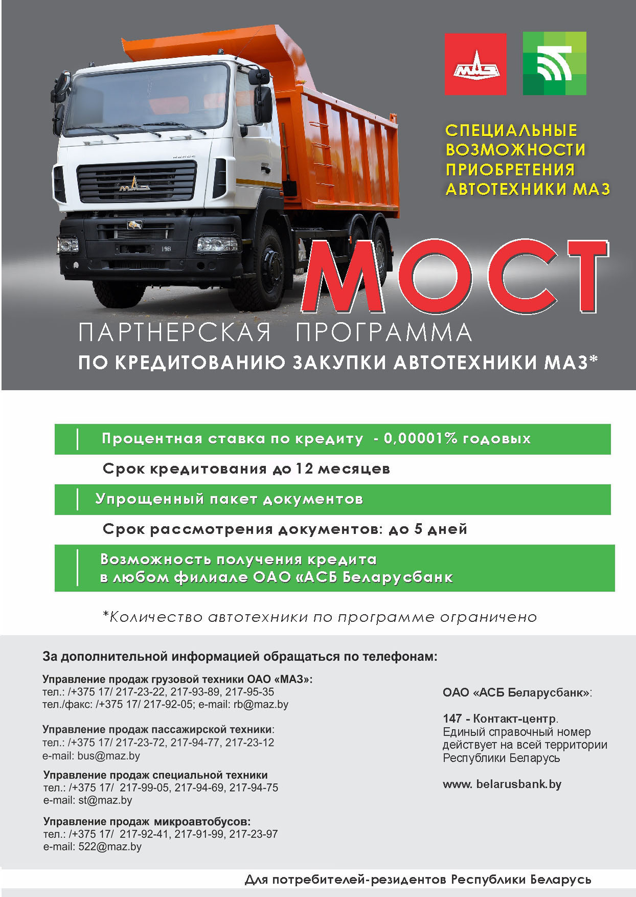 Минский автомобильный завод и ОАО "АСБ Беларусбанк" представляют партнерскую программу по кредитованию закупки автотехники.
